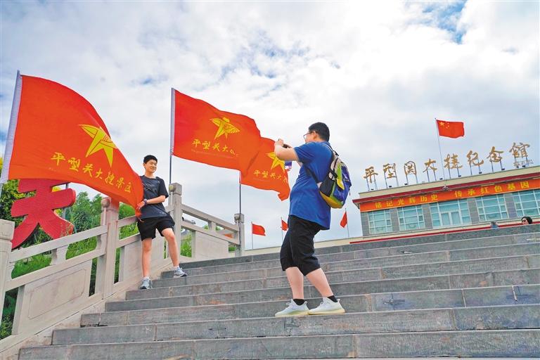 7月5日,观众在大同市灵丘县平型关大捷纪念馆广场留影。该馆是全国爱国主义教育示范基地,免费开放以来每年接待游客30万人次。经济日报记者李秋旸摄