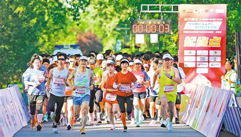 6月15日拍摄的临汾市全民健身万米挑战赛,选手在汾河文化生态景区内角逐。李现俊摄(中经视觉)