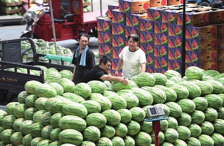 随着本地西瓜大量上市,西瓜价格持续回落。图为7月20日,省城河西农副产品市场内,商户正忙着卸货。邓寅明 摄