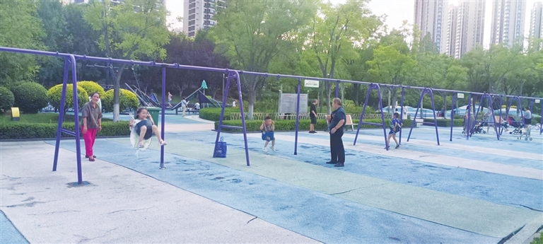 和平公园位于千峰南路与南内环西街的西南方,是千峰片区、九院沙河附近居民们休闲健身的主要公园之一。其中的儿童乐园位于园区东南部,是公园里人气最旺的地方。这里最大的特色就是“一水儿”的秋千,足有三四十架。8月9日傍晚,记者在这里看到,不少爷爷奶奶带着学龄前儿童,以及低年级的孩子们正在荡秋千,“高点,高点,再高点……”不远处,滑梯、攀爬等设施处也满是欢声笑语。园区还在乐园旁设置了许多座椅,孩子们玩的时候,大人也能坐着休息。