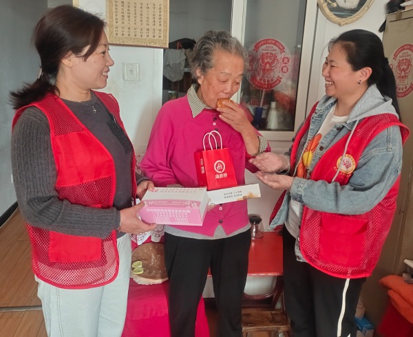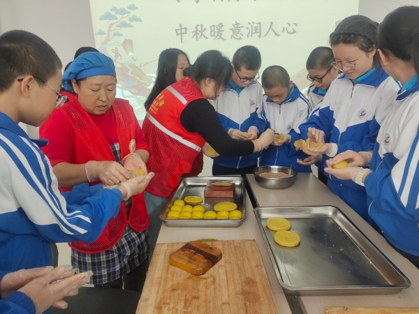 活动当天,现场气氛温馨热烈。社区工作人员与志愿者提前准备好了面粉、馅料、模具等制作材料,还特别配备了多种造型别致的特色模具。他们耐心细致地为孩子们演示揉面、擀皮、包馅、压模等月饼制作流程,并手把手帮助孩子们调整手法和力度。孩子们神情专注,有的仔细捏合饼皮防止露馅,有的兴奋地挑选心仪的图案模具。不一会儿,一个个造型饱满、纹路清晰的月饼逐渐摆满烤盘,空气中弥漫着浓浓的香甜气息。月饼出炉并分装完成后,社区志愿者与孩子们共同组成“中秋送暖小队”,分组前往辖区老党员、困难家庭及失独老人家中,送上香甜的月饼和温暖的节日祝福。