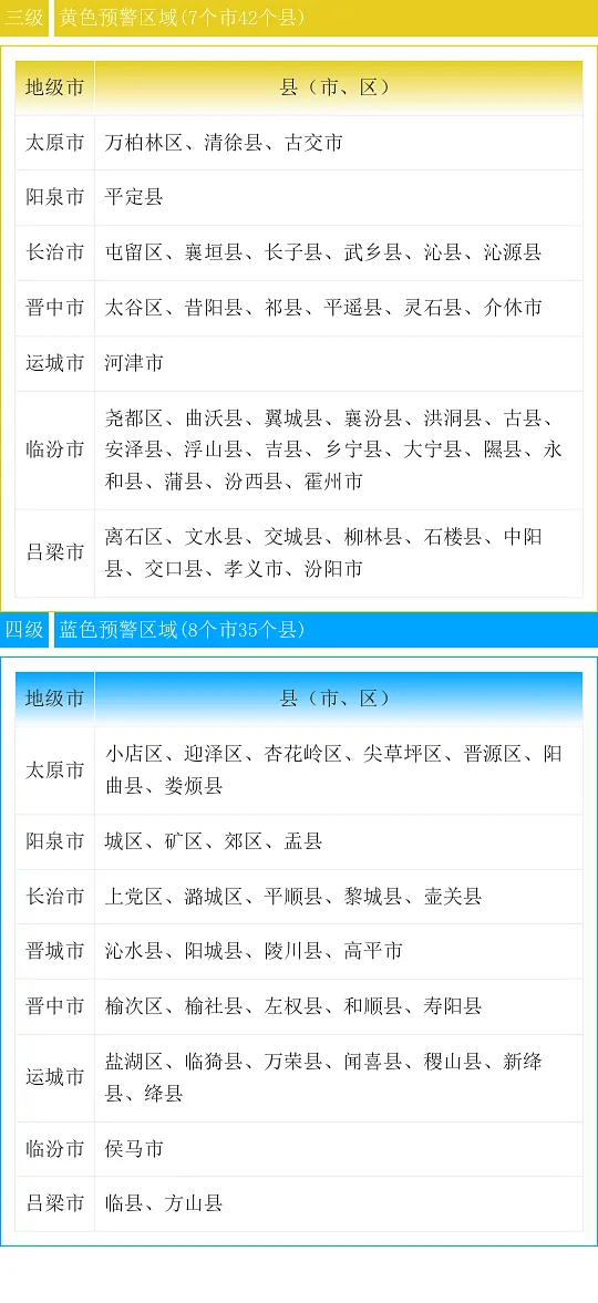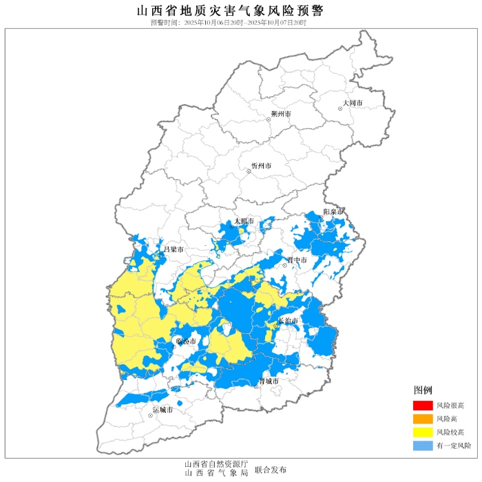 山西省自然资源厅和山西省气象局2025年10月6日16时00分联合发布地质灾害气象风险预警:预计10月6日20时-10月7日20时,太原市万柏林区、清徐县、古交市、阳泉市平定县、长治市屯留区、襄垣县、长子县、武乡县、沁县、沁源县、晋中市太谷区、昔阳县、祁县、平遥县、灵石县、介休市、运城市河津市、临汾市尧都区、曲沃县、翼城县、襄汾县、洪洞县、古县、安泽县、浮山县、吉县、乡宁县、大宁县、隰县、永和县、蒲县、汾西县、霍州市、吕梁市离石区、文水县、交城县、柳林县、石楼县、中阳县、交口县、孝义市、汾阳市部分区域地质灾害气象风险预警级别为三级(黄色预警),发生地质灾害的风险较高。请上述地区政府、部门和群众根据预警等级采取相应的防范措施,加强雨前排查、雨中巡查、雨后核查。