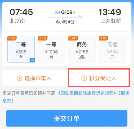 选择想要兑换的车次和席别后,点击“积分受让人”,提交订单后点击“积分支付”即可。兑换的车票可办理1次改签并扣减部分积分作为改签费,不办理退票、变更到站业务。