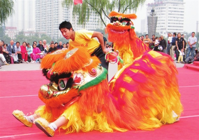 舞狮表演大致分有10个场景,即:跑场子、拜四方、抖毛咬尾、直立走、横打滚、登天台(上桌子)、滚绣球、过天桥(过长板凳)、母狮下崽和谢幕。而最令人称奇的“母狮下崽”,则诞生于一段温情往事。上世纪30年代,张壁看到狮子会里光棍汉居多,便在表演中加入了生命传承的寓意。“我师父张吉祥是张壁的儿子,当年他就跟着父亲参加表演。当时他不满10岁,就扮演小狮子,要从母狮后腿间钻出来,还要学着幼狮颤巍巍地站立。”康保堂比画着动作,“母狮要先用头轻蹭小狮子,再慢慢舔毛,最后小狮子才能试着吃奶。这一连串动作,要做得自然,做得动人。”