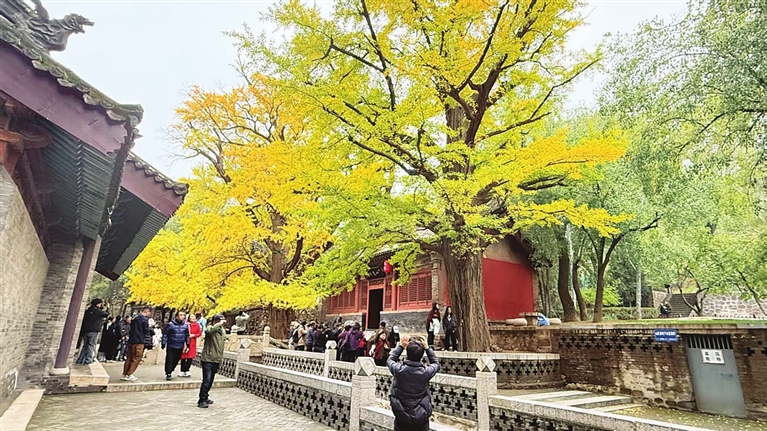 据工作人员介绍,这两株枝干相依的古银杏不仅是“资深网红”,更是承载历史的“活文物”。它们历经500年风雨,至今枝繁叶茂,每年深秋都会如期换上“黄金盛装”,与圣母殿、鱼沼飞梁等著名古建筑共同构成一幅动人的秋日画卷。