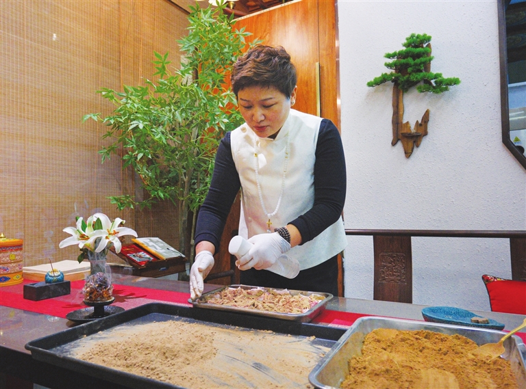 “我现在多用海南沉香,尤其是老沉香,一点就会有一股浓浓的花香,所以将其作为玫瑰花香的主料。”李慧青表示,在制作过程中,首先就是选料,其中各种材料的配比也很关键。要用到海南沉香的老料、沉水料以及普通沉香等多种沉香料相结合,使得沉香既不霸占花的香味,又能衬托出花的味道,这点至关重要。第二步是炮制沉香,就是要把沉香打成粉末状。第三步是“窨花”,就是用鲜花来窨,使沉香粉料里饱含所有的花气,这一步骤最为辛苦,但也最令人心情愉悦。