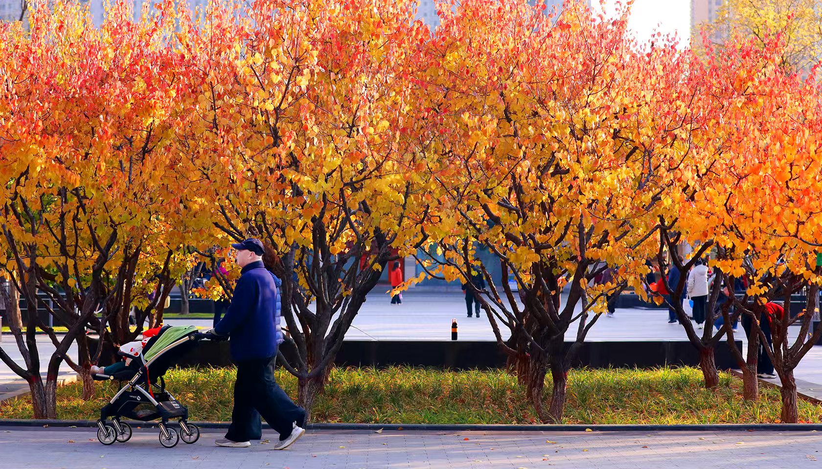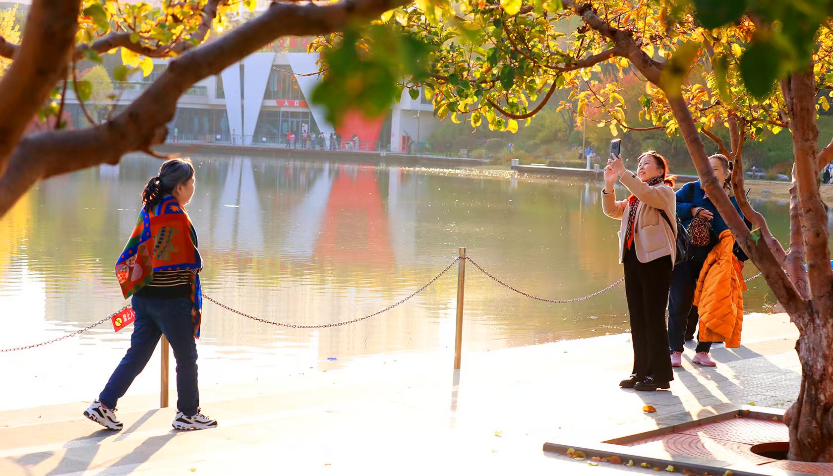 这如画的美景,更是人们生活的背景。湖畔的长椅上,银发的长者并肩而坐,他们或闭目养神,任凭暖阳熨帖着苍老的皱纹;或闲话家常,目光里是历经岁月后的从容与安详。树下的空地上,有老先生提着毛笔,以水为墨,在地砖上挥毫,笔走龙蛇间,字迹显现又悄然隐去,如同时光本身。不远处,是阖家欢乐的温馨场面。年轻的父母推着婴儿车,踩着满地落叶,孩子伸出小手,试图接住一片旋转而下的梧桐叶;孩子们在草地上追逐嬉戏,清脆的笑声惊起了枝头的小鸟。那份其乐融融的温暖,仿佛连秋日的凉意都被驱散了。