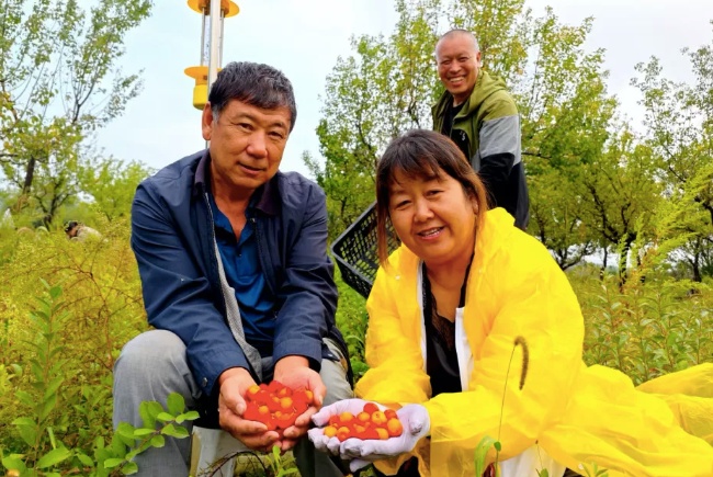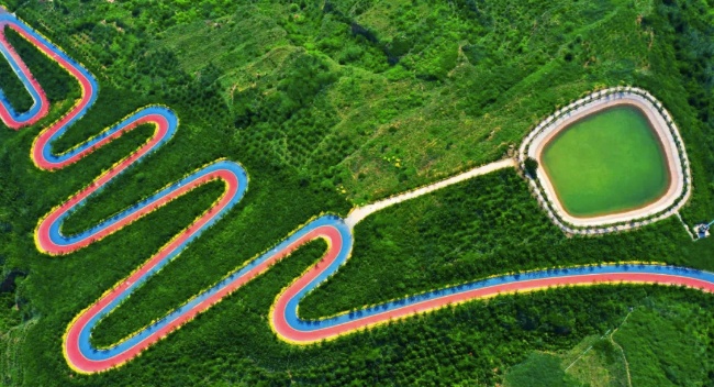 蜿蜒的自行车赛道穿过秋收的田野,饱满的玉米与成片的钙果,正是“金山银山”的生动写照。