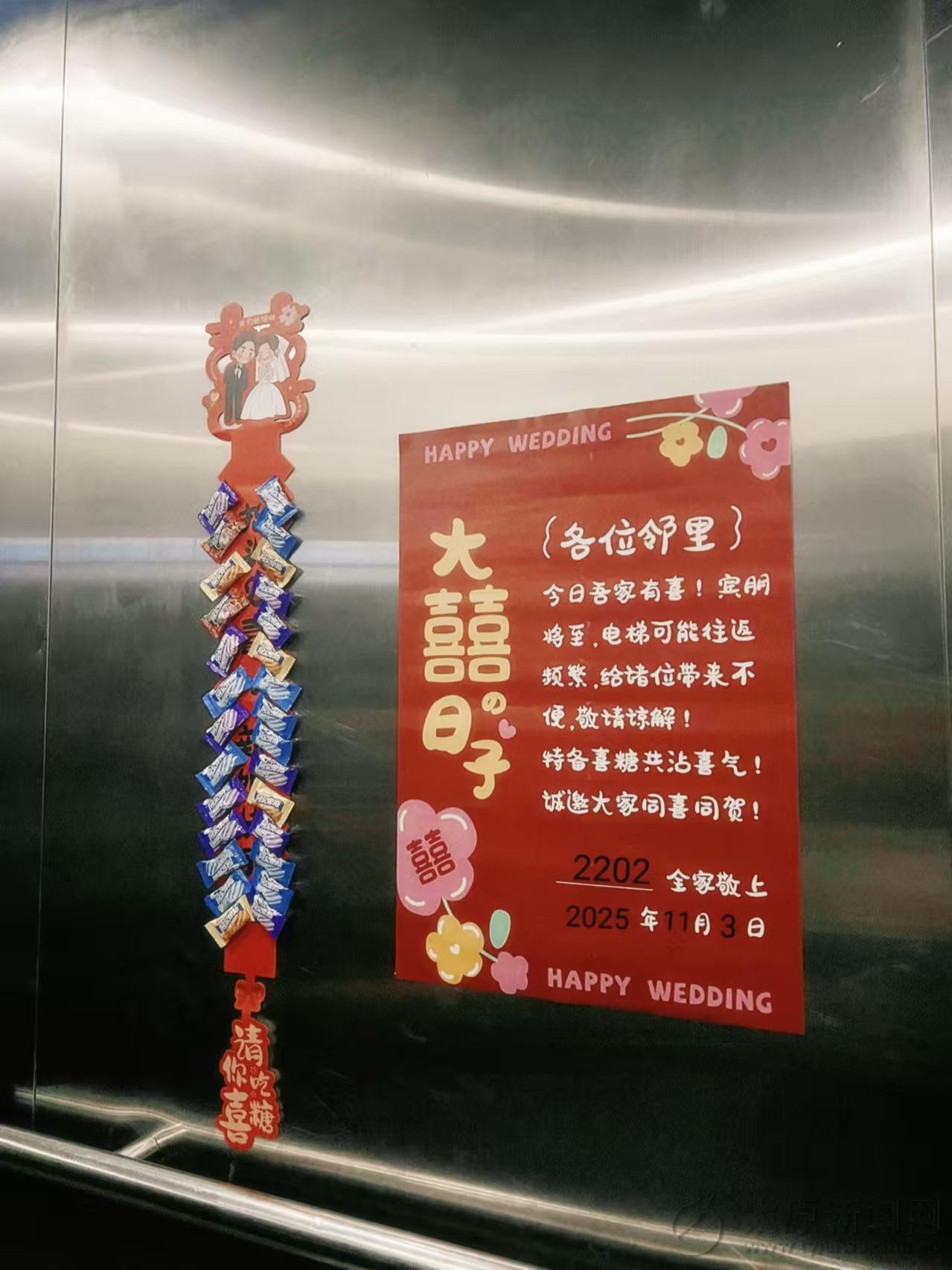 担心接亲的人多占用电梯,11月3日,我市一对新人在电梯张贴提示表达歉意,并放置喜糖供邻居取用。居民们对此表示理解和开心,纷纷在群里献上祝福。
