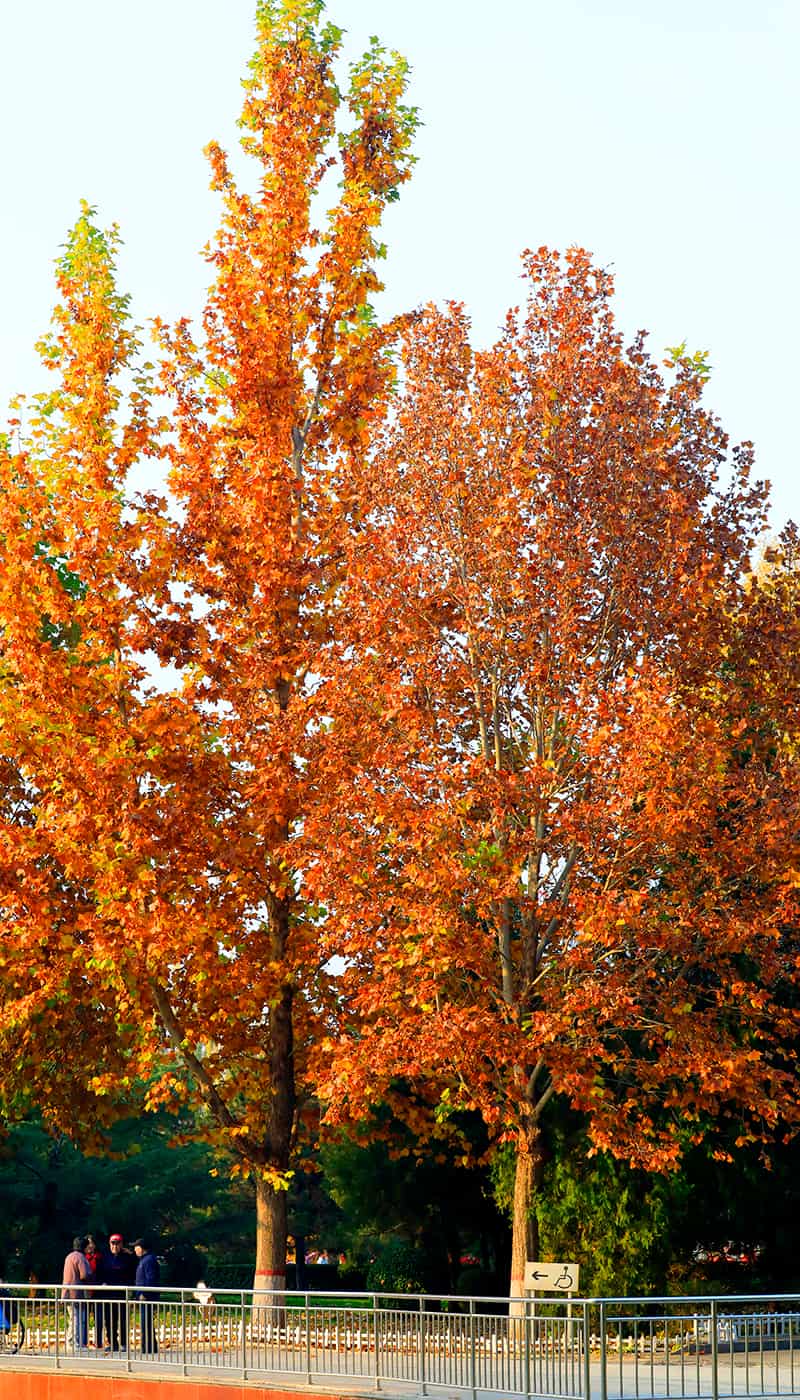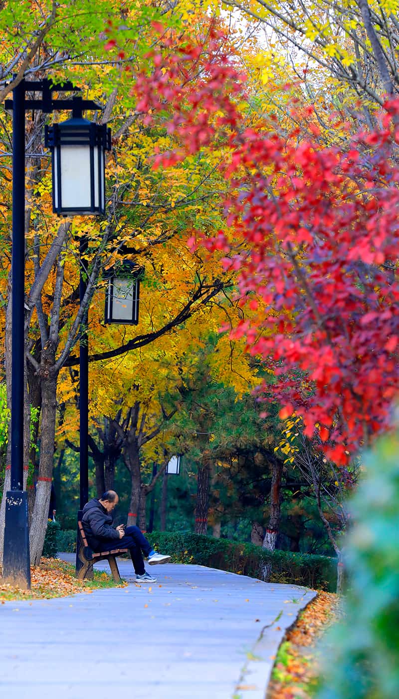 当季节的轮盘转入深秋,这里的每一寸土地,仿佛都被太上老君不慎打翻的八卦炉丹染过。不再是单一的灿金或赤红,而是一场色彩的盛大交响——银杏的黄,明亮而耀眼,像是洒了一地的阳光;枫树的红,炽烈而温暖,仿佛在枝头点燃了团团火焰;常青松柏的绿,沉稳而坚毅,默默做着所有绚烂的背景板;还有那过渡色的橙与褐,交织其中,调和出独属于秋的温柔与静谧。