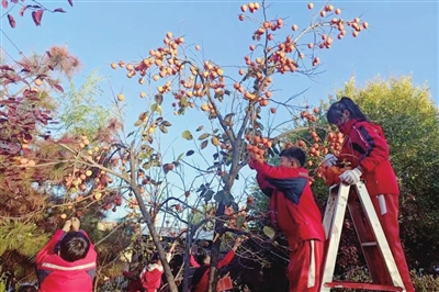 几棵柿子树宛如点燃的火炬,孩子们仰着头穿梭其间,目光追随着由浅黄渐深至橘红的果实轨迹。欢声笑语中,一个个柿子被摘了下来,果实沉甸甸,孩子们捧着它闻一闻,细细端详,再递给同伴装筐,空空的筐子很快变得满满当当。