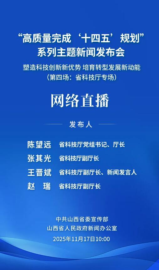 2025年11月17日上午10时,中共山西省委宣传部、山西省人民政府新闻办公室将举行“高质量完成‘十四五’规划”系列主题第四场新闻发布会。省科技厅有关负责同志将介绍“十四五”时期全省科技创新发展有关情况,并答记者问。