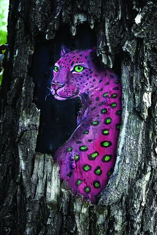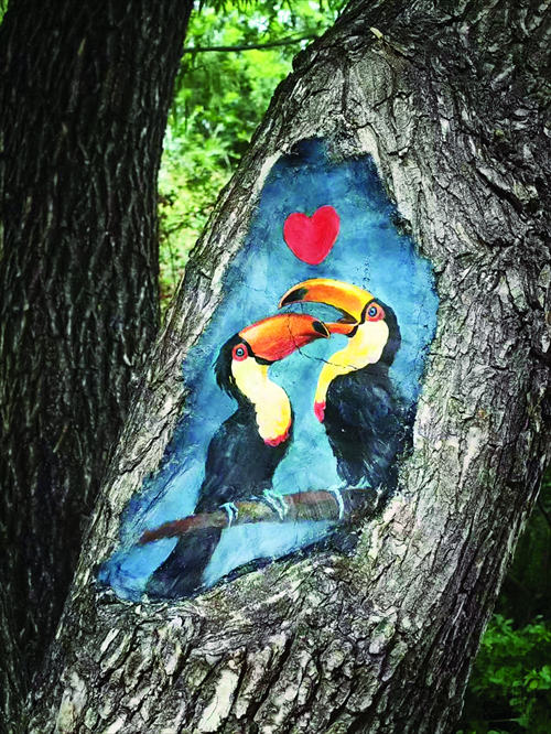 在创作过程中,她始终将环保理念放在首位。树洞是树木的“伤口”,决不能对它们造成二次伤害。她使用的颜料都是环保的丙烯材料,这种材料具有防水防晒的特性,能够长久地保持画面的鲜艳与清晰。更为重要的是,它对树木具有抗腐蚀的保护作用,不会对树木的生长造成任何伤害,还能让大树更健康、更美丽。她希望自己的创作不仅能为城市带来美,更要以一种温和、友好的方式融入自然环境,实现艺术与生态的和谐共生。
