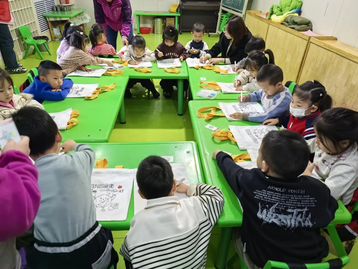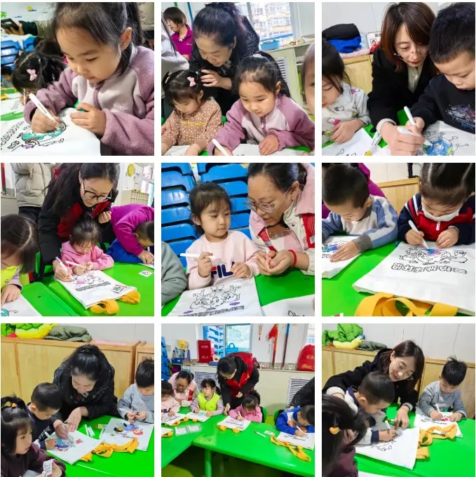 蓝天、绿树、可爱的娃娃……小小的手提袋成了承载无限创意的画布。孩子们不仅用艺术表达了对美好环境的向往,更在协作中学会了沟通与分享。我院心理老师也借此机会,在轻松的氛围中观察并引导孩子们的情感表达,实践着“赋能家庭”的核心理念。