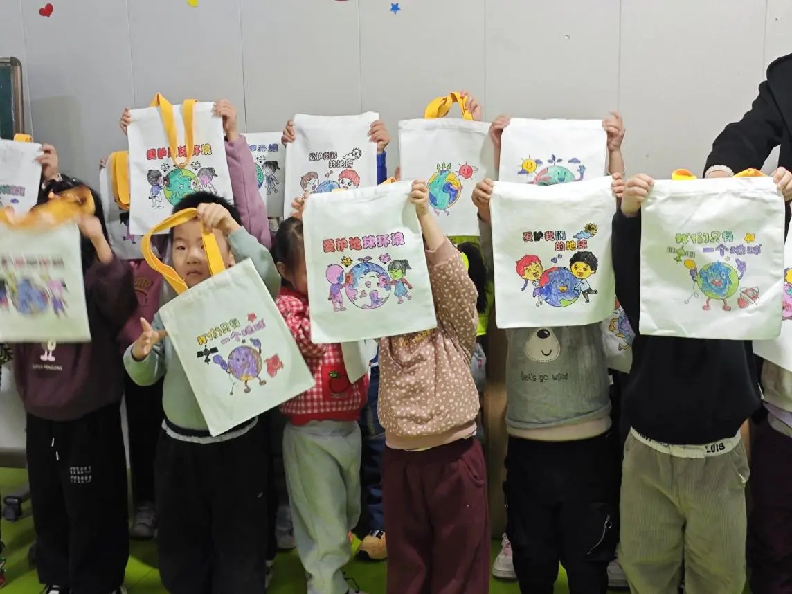 创作完成后,孩子们自豪地举起自己独一无二的“地球手提袋”进行展示。每一幅作品都是童真与责任的生动交融,现场化身为一个充满成就感的微型画展。