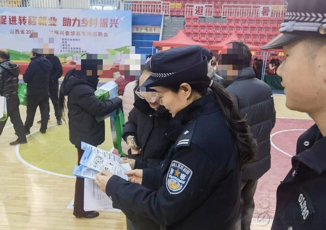 11月20日,“促进转移就业助力乡村振兴”山西省2025年乡村振兴娄烦县专场招聘会举行。当天,娄烦县公安局城关派出所提前谋划、精准布防,将现场执勤与反诈宣传“同部署、同推进”,既护招聘会有序,更守群众“钱袋子”。
