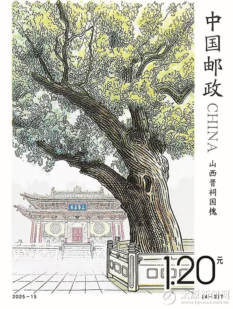 今年8月15日,中国邮政面向全国发行《古树名木》特种邮票,一套4枚,其中包括了四种不同种类的珍贵树木。晋祠国槐因其千年历史和丰富文化内涵,在众多古树中脱颖而出,跻身这套邮票之列。