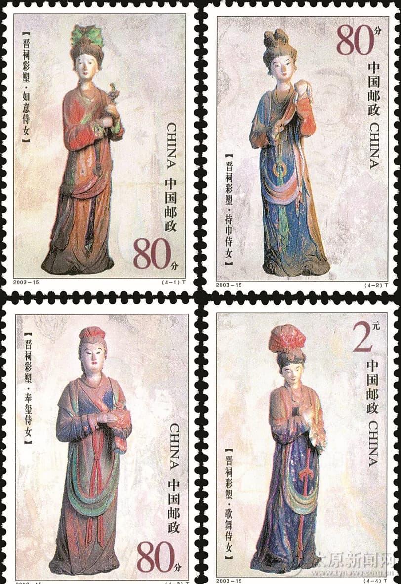 这并不是晋祠景物第一次荣登邮票。2003年8月16日,为了纪念太原建城2500周年和展示历史悠久的彩塑艺术,中国邮政发行《晋祠彩塑》特种邮票一套4枚,邮票分别描绘了晋祠彩塑中如意侍女、持巾侍女、奉玺侍女、歌舞侍女的生动形象。