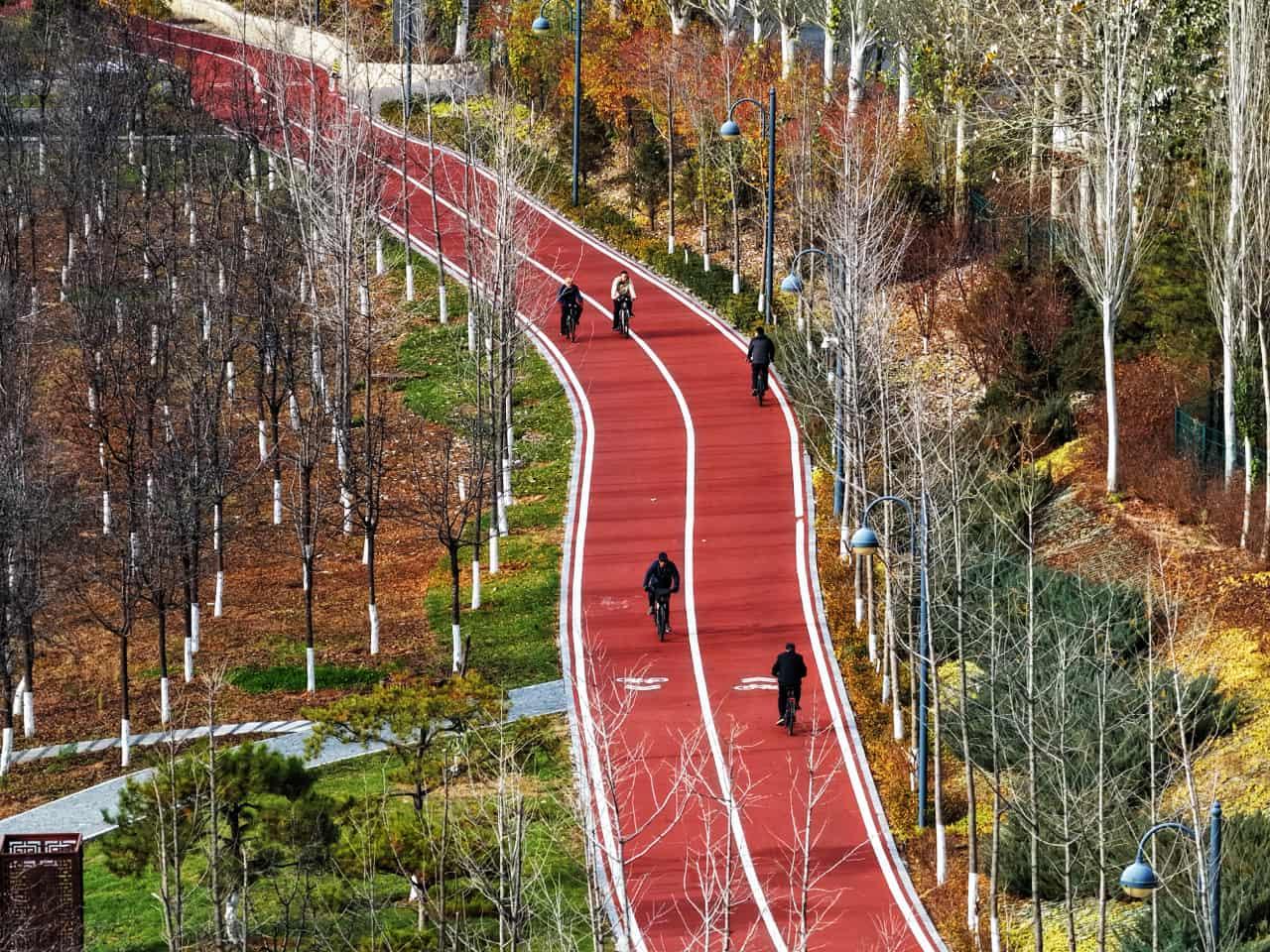 11月23日,市民沐浴着初冬的暖阳,悠然骑行在汾河景区自行车道,尽情享受运动时光。