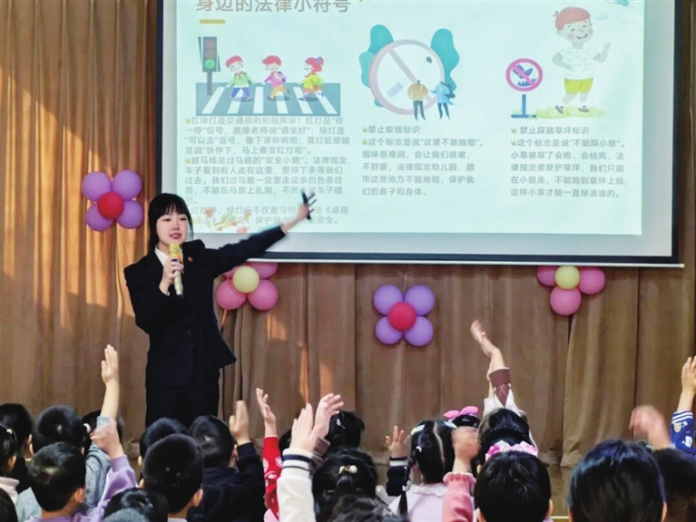 对幼儿园孩子来说,法律不是厚厚的法典,而是藏在身边的“好朋友”。法官助理武祯玉用孩子最熟悉的场景打比方,一下子拉近了孩子与法律的距离:法律是“超级守护者”,像爸爸妈妈和老师一样,护着大家安全上学、开心玩耍;法律是“游戏规则”,就像玩“老鹰捉小鸡”时,得有“母鸡护小鸡、老鹰不耍赖”的规矩才好玩,生活里的法律也是如此,大家都遵守规则,每天才能像玩游戏一样开心;法律是我们的“好朋友”,默默帮忙远离危险,陪着大家笑着长大。