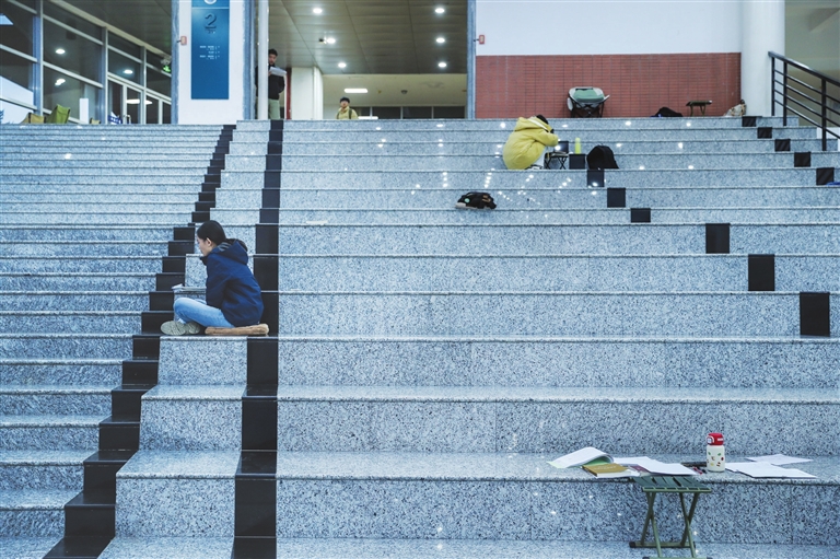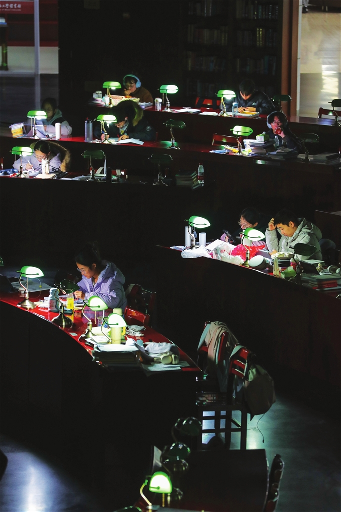 太原理工大学的楼道里,一位女生裹着被子,紧挨暖气片埋头苦读。熄灯后的走廊尽头,只有一盏灯、一扇漆黑的玻璃窗,映着一张专注的脸。山西大学图书馆内,一盏盏台灯在书桌上投下静谧的光晕,映照着学子们时而蹙眉沉思、时而奋笔疾书的年轻面庞。每个人都沉浸在知识的海洋中,争分夺秒。