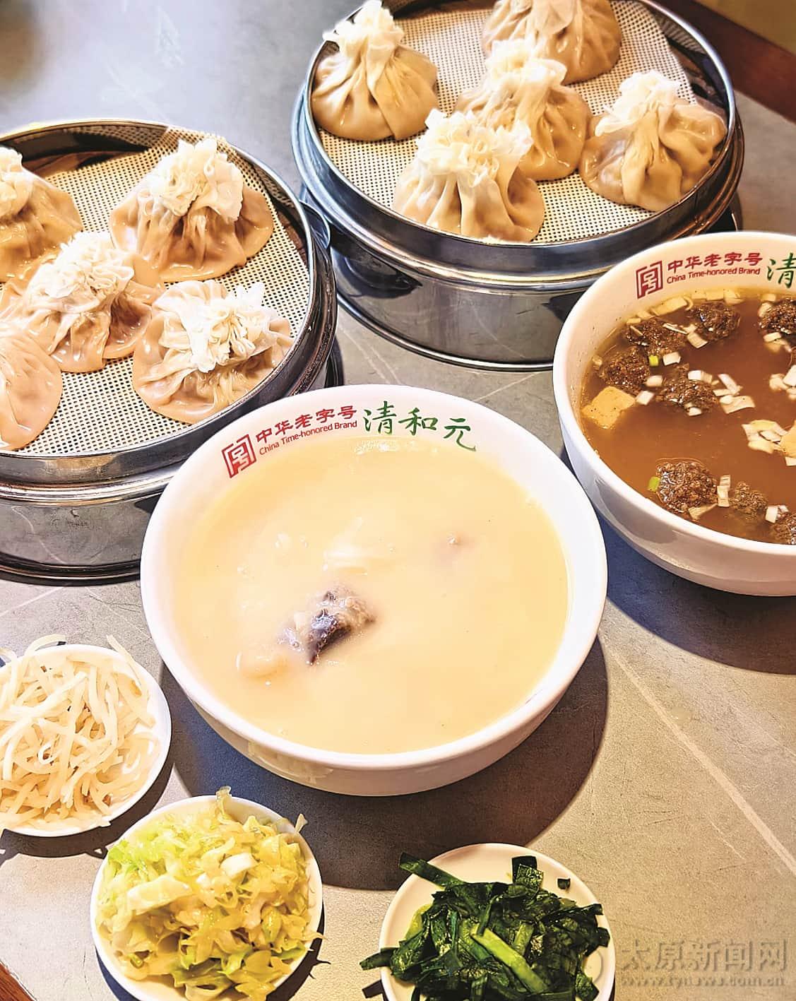 我们一家四代五口人天微微亮时来到了清和元,这里的经理热情地和祖父打着招呼:“老爷子,您来啦!老位置给您留着呢!”一股混合着黄酒、羊肉、黄芪与良姜的温暖的馥郁香气,立刻将我们包裹。这香味,就是“头脑”的灵魂,是太原人冬日清晨最熟悉的味道。店堂里人声鼎沸,多是些上了年纪的老主顾,也有像我们这样携家带口的。大家呼噜呼噜地吃着,聊着家常,呵出的白气与碗里冒出的热气交融在一起。祖父不用看菜单,便熟稔地吩咐:“四碗双碗,一壶烫得热热的黄酒,一碟腌韭菜,一笼羊肉烧卖。”第一次来喝头脑的小禾扒着桌沿,好奇地瞅着邻桌蓝边海碗里那乳白色的糊羹,吸着小鼻子问:“太爷爷,这个白乎乎、闻着有点药味的东西,为啥叫‘头脑’呀?它长得一点也不像脑袋瓜。”