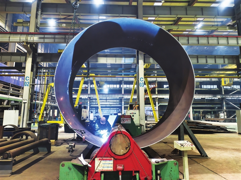 12月9日,山西转型综改示范区山西钢构科工有限公司钢结构智能制造车间内,工人们争分夺秒赶制订单,努力实现全年生产目标,保障重点项目。图为工作人员在进行卷圆作业。