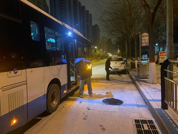 五车队所辖的6条线路途经府东街大坡、南内环东延段,一下雪就是重点盯防区域。这些坡道在冰雪天气极易导致车辆打滑,为此车队启动了“双重保障机制”。