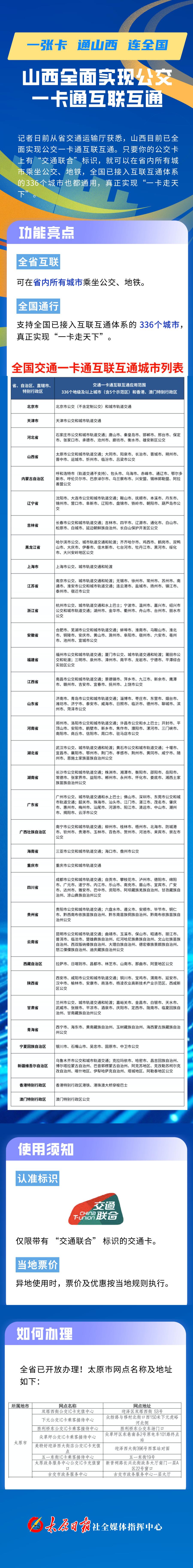 记者日前从省交通运输厅获悉,山西目前已全面实现公交一卡通互联互通。只要你的公交卡上有“交通联合”标识,就可以在省内所有城市乘坐公交、地铁,全国已接入互联互通体系的336个城市也都通用,真正实现“一卡走天下”。