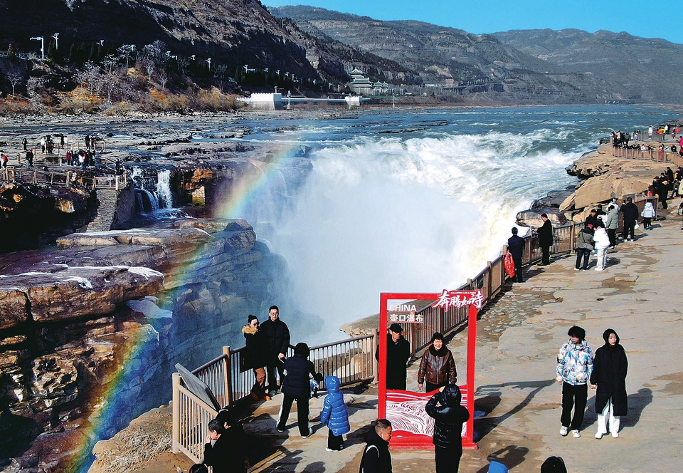 12月20日,游客在吉县黄河壶口瀑布旅游区游览拍照。为激活冬季旅游市场,该景区联动陕西黄河壶口瀑布旅游区,推出全国游客免门票优惠活动,打造“核心引流+全域消费”的冬季旅游生态圈,赋能县域经济发展。(吕桂明 摄)
