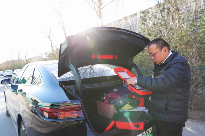 12月24日,滨楠兴业网约车司机正在调试车载AED(自动体外除颤仪)。近日,滴滴出行联合中国红十字基金会、天龙救援队启动“滴滴车载AED志愿服务”,向持有救护员证的网约车司机志愿者的运营车辆配备车载AED。目前,太原已有30辆滴滴网约车配备了车载AED。王韵菲 摄