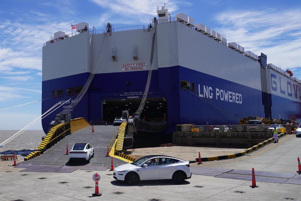 在上海自贸试验区临港新片区南港码头,一批新能源汽车驶向一艘滚装货轮。新华社记者 杨有宗 摄