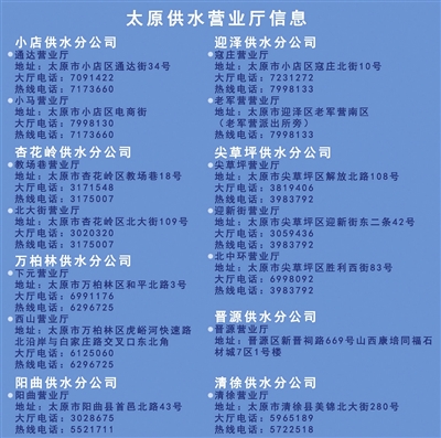 今后,各城区居民遇到供水问题,除了可以继续拨打太原供水集团24小时服务热线3094444外,也可以就近联系所在城区分公司,第一时间获取帮助。