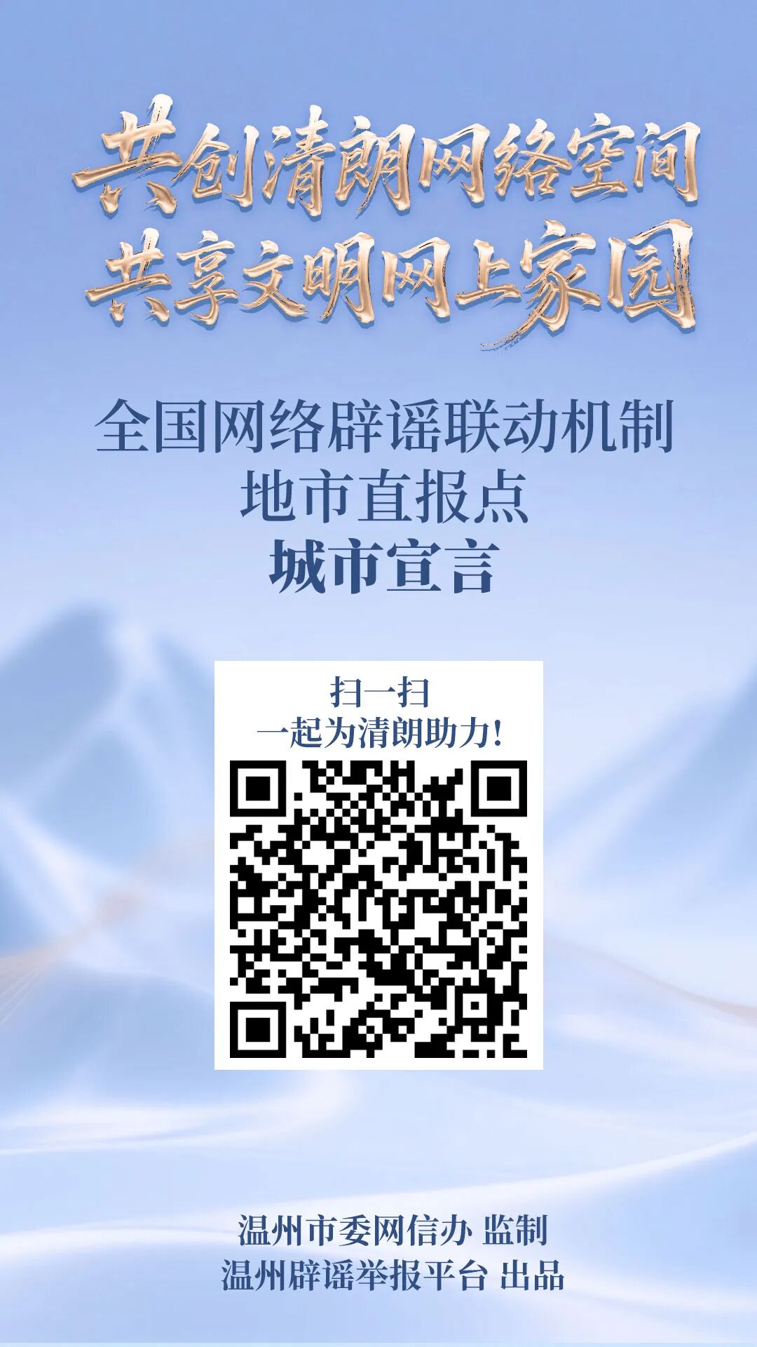1月26日下午,以“深化辟谣联动共建清朗网络”为主题的全国网络辟谣联动机制直报点建设现场推进会在浙江温州举办。会上,全国网络辟谣联动机制直报点共同发出《“共创清朗网络空间·共享文明网上家园”城市宣言》,号召社会各界坚守理性,做真实信息的守护者;主动作为,做谣言治理的行动者;凝聚合力,做清朗空间的共建者;弘扬新风,做网络文明的践行者,合力开拓更加健康、向上、美好的网络时代新未来。