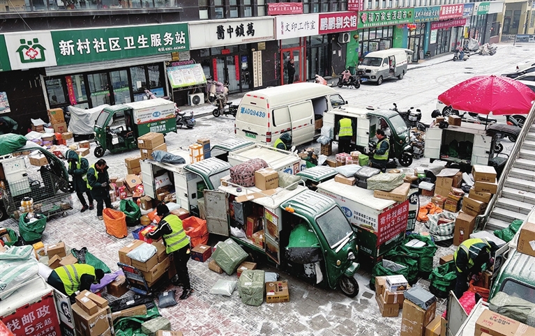 春节日益临近,不少市民开始通过网上购买年货,快递量明显增加。图为1月26日,省城东中环路某快递驿站,工作人员搬运快件。