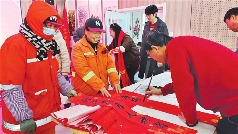 1月27日,长治路二社区邀请老、中、青三代书法爱好者齐聚一堂,现场挥毫书写“福”字和春联,将一份份带着墨香的新春祝福,送给辖区辛勤工作的环卫工,邻里情谊在翰墨飘香中愈发深厚。