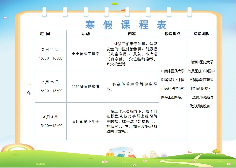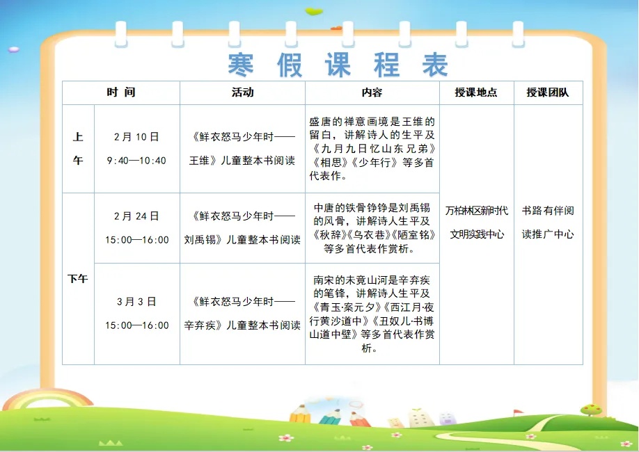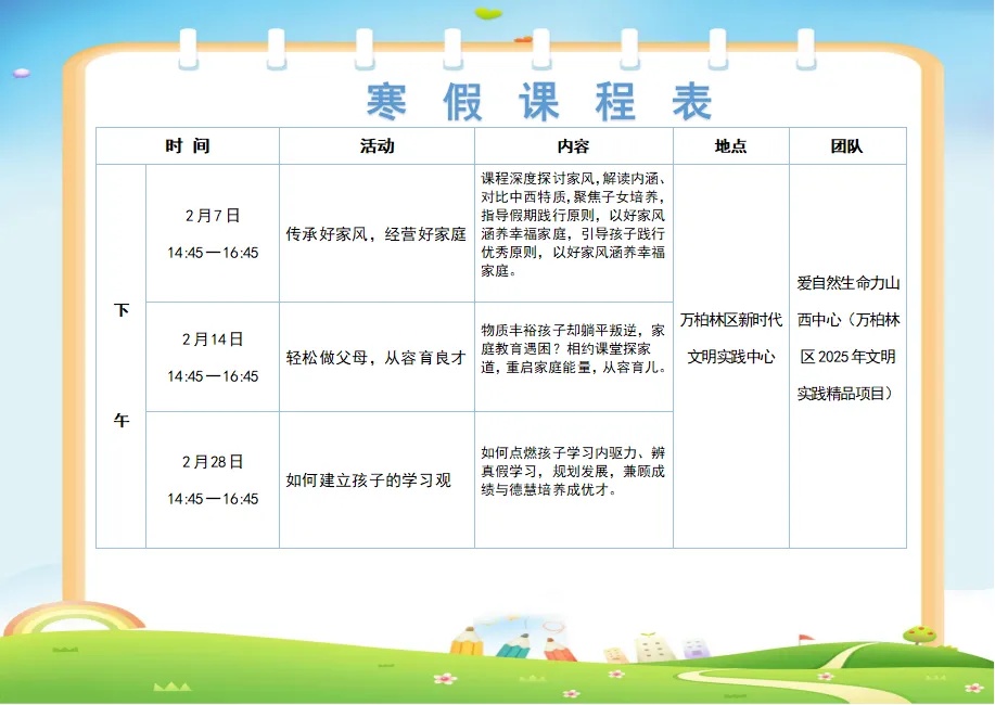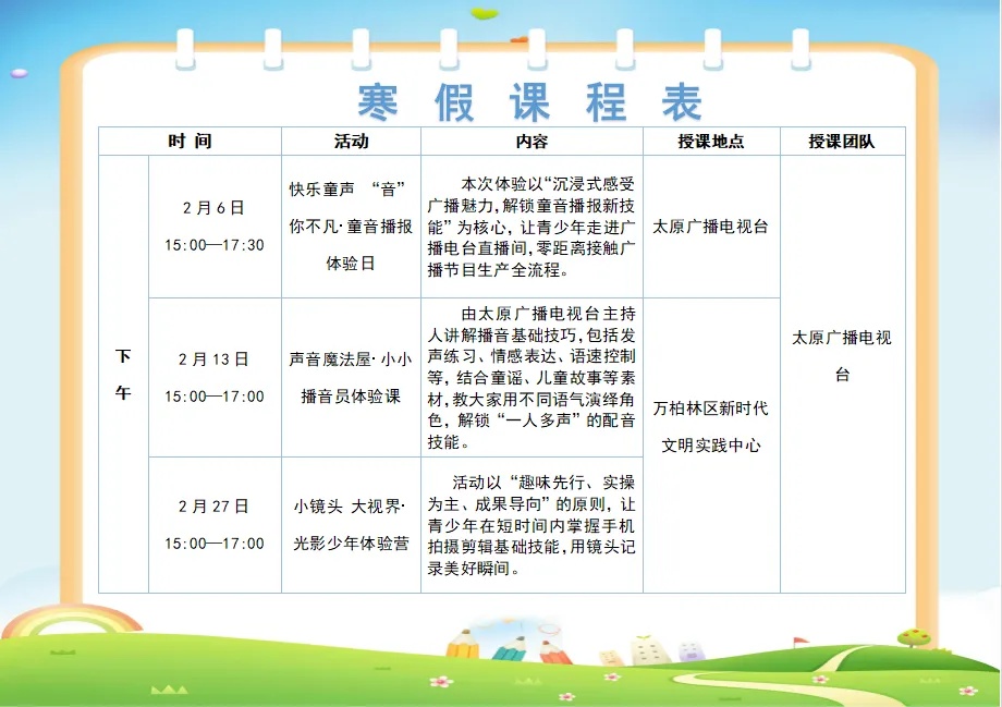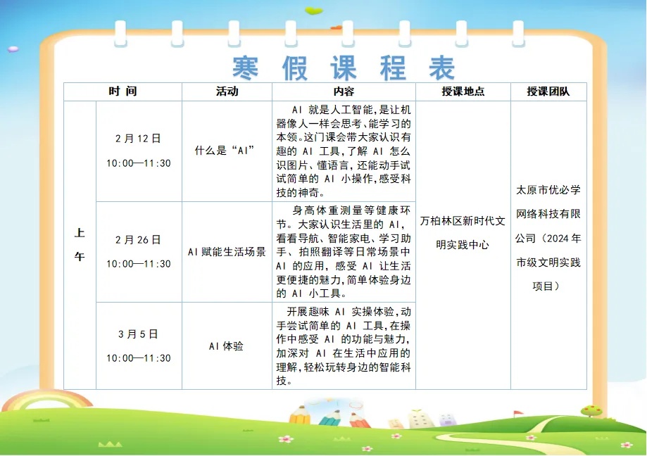 同时,全区各新时代文明实践所(站、点)同步开展寒假托管、亲子非遗工坊等活动,欢迎广大青少年就近就便参与~【伙伴计划·爱心托管班】万柏林区爱心托管班开始报名啦!