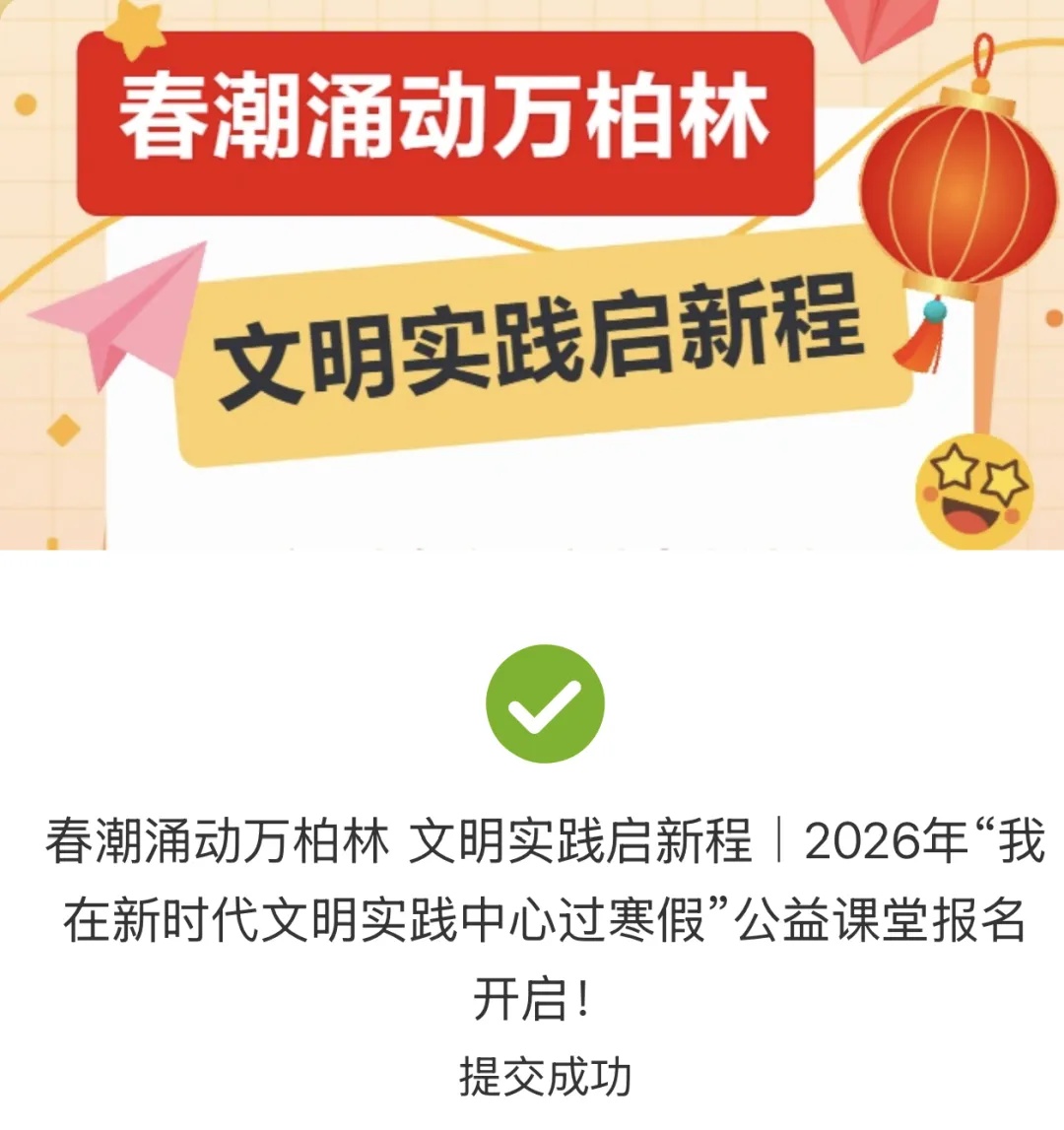 除寒假课程外,万柏林区新时代文明实践中心寒假期间还将陆续开展红色影厅寒假观影活动,同步推出迎新春送“福”到家、“小手拉大手文明过新年”NPC情景互动体验、“你身边的博物馆”晋博祥瑞特展等系列“2026我在新时代文明实践中心过大年”主题示范活动。更多详情点击【春潮涌动万柏林】文明实践启新程——2026年,邀您在新时代文明实践中心过大年!