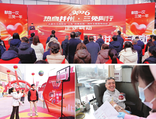 1月29日,“热血并州·三免同行”太原市无偿献血“三免”政策实施一周年主题宣传活动在太原万象城户外广场启动。上图为活动现场;左下图为市民参与趣味活动;右下图为市民参与无偿献血。牛利敏郭苑甫张倩云摄影报道