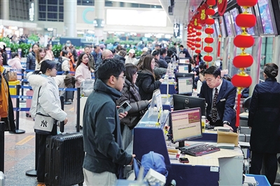 时间还早,市民杜芳带着6岁的女儿,悠闲地逛着候机楼内的特色店铺。她说:“春运已经不再是从前那副‘疲惫不堪’的样子,能享受到很多人性化的服务,出行体验越来越舒适。”