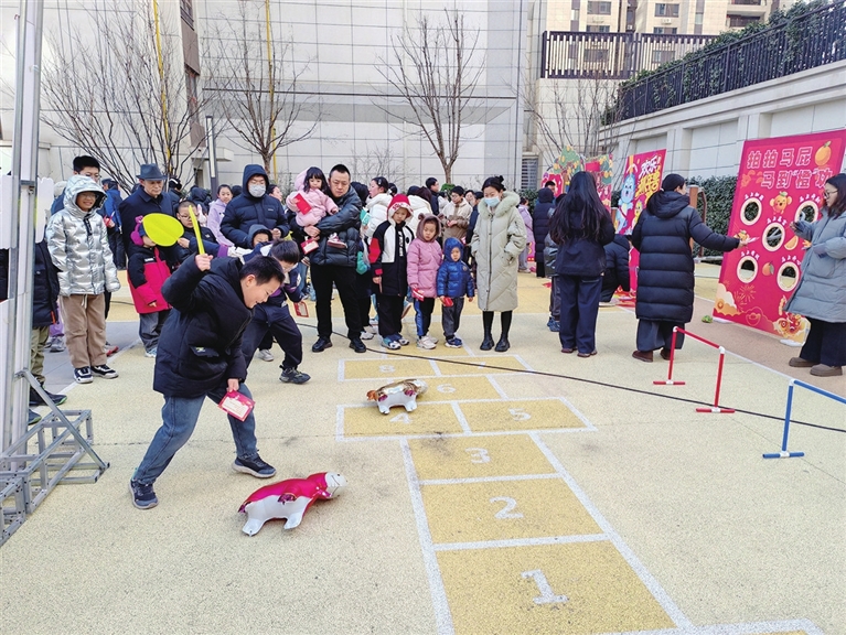 小区院里,投壶、扔沙包、赶小马等趣味游戏,吸引了许多居民参与。2月7日,中海社区举办新春游园会活动,家长、孩子在欢声笑语中体验浓浓的年味,享受着快乐时光。