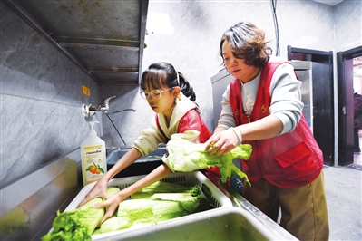 太原市迎泽区第三实验小学五年级学生郁佳玥与妈妈一起洗菜。这对母女是通过网络了解到这家面馆,这是第一次在这里做志愿者。