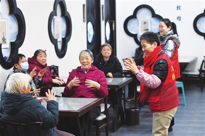 54岁的王雪琴带领老人们做餐前操,她与丈夫在这里做志愿者已有半年时间。