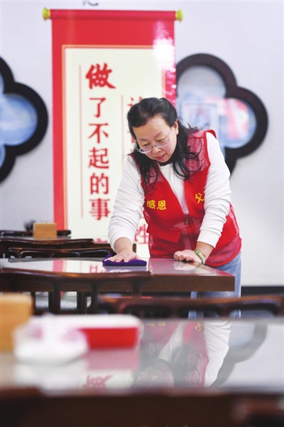 45岁的王晓颖负责餐后的保洁工作,她做志愿者时间已超过一年。