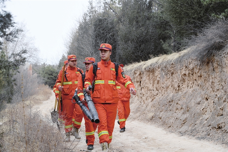 春节期间,杏花岭区综合应急大队中涧河中队加强森林防火巡查,并组织队员深入林区村镇、田间地头开展森林防火宣传活动,筑牢森林安全屏障。图为2月23日,队员们在枣沟村附近巡查。牛利敏 摄