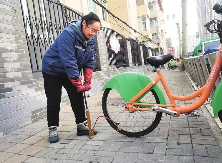 到岗第一步是逐车“体检”:测胎压、查前后轮,缺气立刻补足;遇到故障车,及时下架,隔离待修;清扫站点杂物、清理车筐垃圾。一番操作下来,额角渗出细汗。