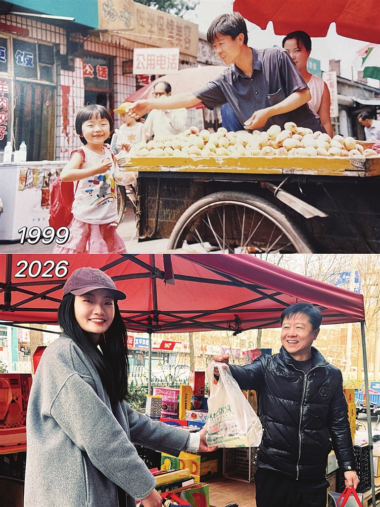 1999年,在义井一家水果摊前,王女士的父亲用相机记录下了女儿灿烂的笑脸。27年之后的2026年春节假期,同样的地点,王女士再次遇到了当年水果摊的老板。这次,用手机,他们再度将影像定格。王女士将当年与如今的两张照片拼接上传至社交媒体,短短4天,便收获了100多万的点赞量,阅读量则突破了千万。