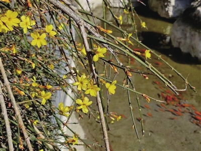 狄仁杰文化公园,锦鲤水中游弋,池边迎春花绽放,一派春天的气息。