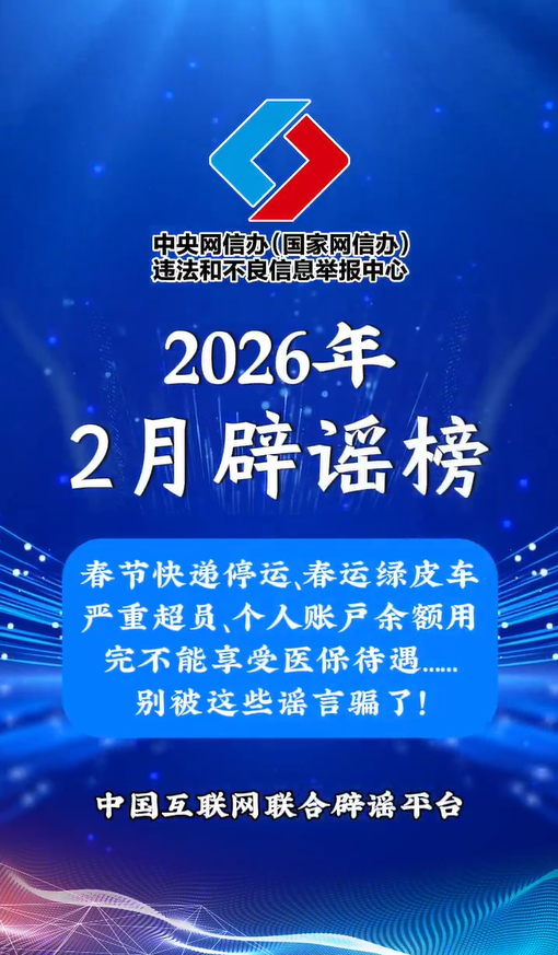 编造民生保障类谣言扰乱民心。网传“2026年春运绿皮车严重超员”视频,相关内容系拼凑历史画面,利用AI生成;“春节快递停运”系谣言,多家快递企业春节正常营运,保障居民寄递需求;“通过小程序可领500元分娩补贴”并非官方正规补贴政策,而是不法分子设置的虚假引流骗局;“个人账户余额用完,不能享受医保待遇”则是对医保统筹保障政策的错误解读,网民切勿因误信谣言而延误正常就医报销。