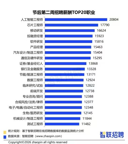 从高薪职业看,新质产业的核心技术岗表现突出:人工智能工程师平均招聘月薪最高,达20804元;芯片工程师、移动研发、软件研发紧随其后,薪酬分别为17790元、16624元、15816元,均体现出技术驱动的高价值属性